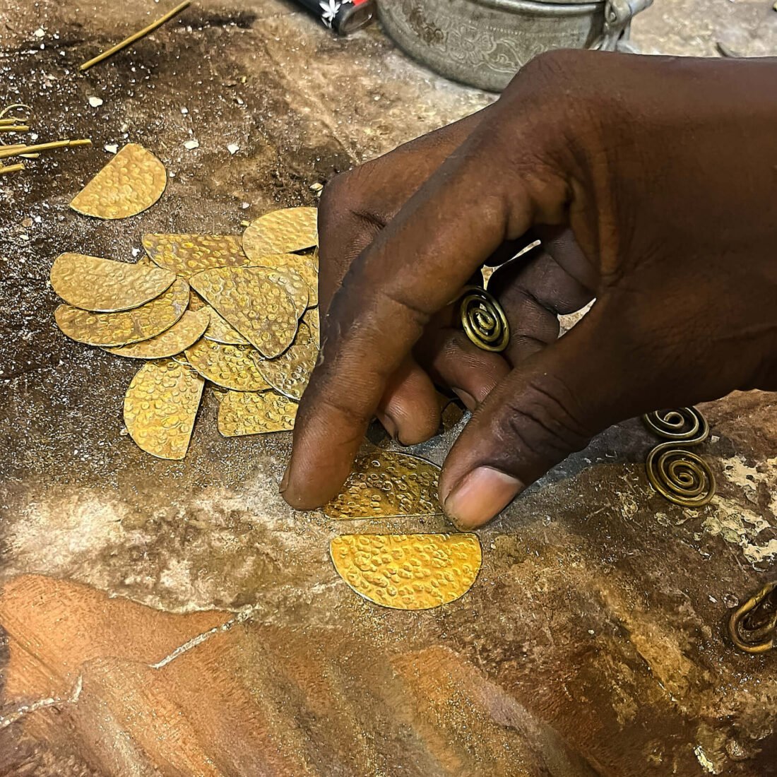 Une grande partie de nos pièces est sculptée à la main par des artisans africains (bronze plaqué or), selon un savoir‑faire ancestral. D’autres bijoux — en acier inoxydable, laiton, ou en argent — sont sélectionnés avec soin pour leur style, leur tenue dans le temps et leur élégance au quotidien.