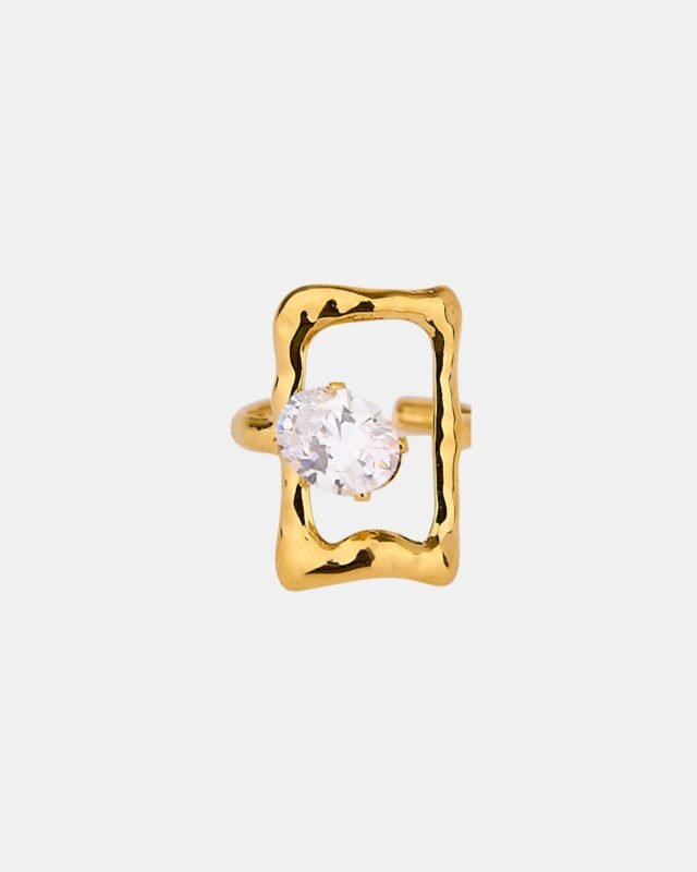 La bague Amaara enchante avec son design vintage colorblock qui marie harmonieusement géométrie moderne et élégance classique. Cette bague ouverte ajustable présente trois pierres de zircone facettées de taille champagne/cognac magnifiquement serties dans un cadre géométrique en acier inoxydable plaqué or. Les pierres présentent une coupe en coussin irrégulier qui maximise leur brillance et crée un jeu de lumière captivant. Disposées de manière asymétrique le long de la bande ouverte, elles créent un effet visuel dynamique et moderne. La plus grande pierre (18mm) fait une déclaration audacieuse, tandis que les deux pierres plus petites (12mm chacune) équilibrent harmonieusement la composition. Les tons chauds champagne et cognac des zircones apportent une sophistication subtile qui se marie parfaitement avec le doré du métal. La conception ouverte permet un ajustement flexible pour s’adapter à différentes tailles de doigts tout en créant une silhouette architecturale distinctive. Le poids de 9,6g offre une présence substantielle qui évoque les bijoux de luxe. Hypoallergénique et résistante, la bague Amaara convient aussi bien au port quotidien qu’aux occasions spéciales. Son style vintage géométrique en fait un choix parfait pour les femmes qui apprécient les pièces intemporelles avec une touche contemporaine.