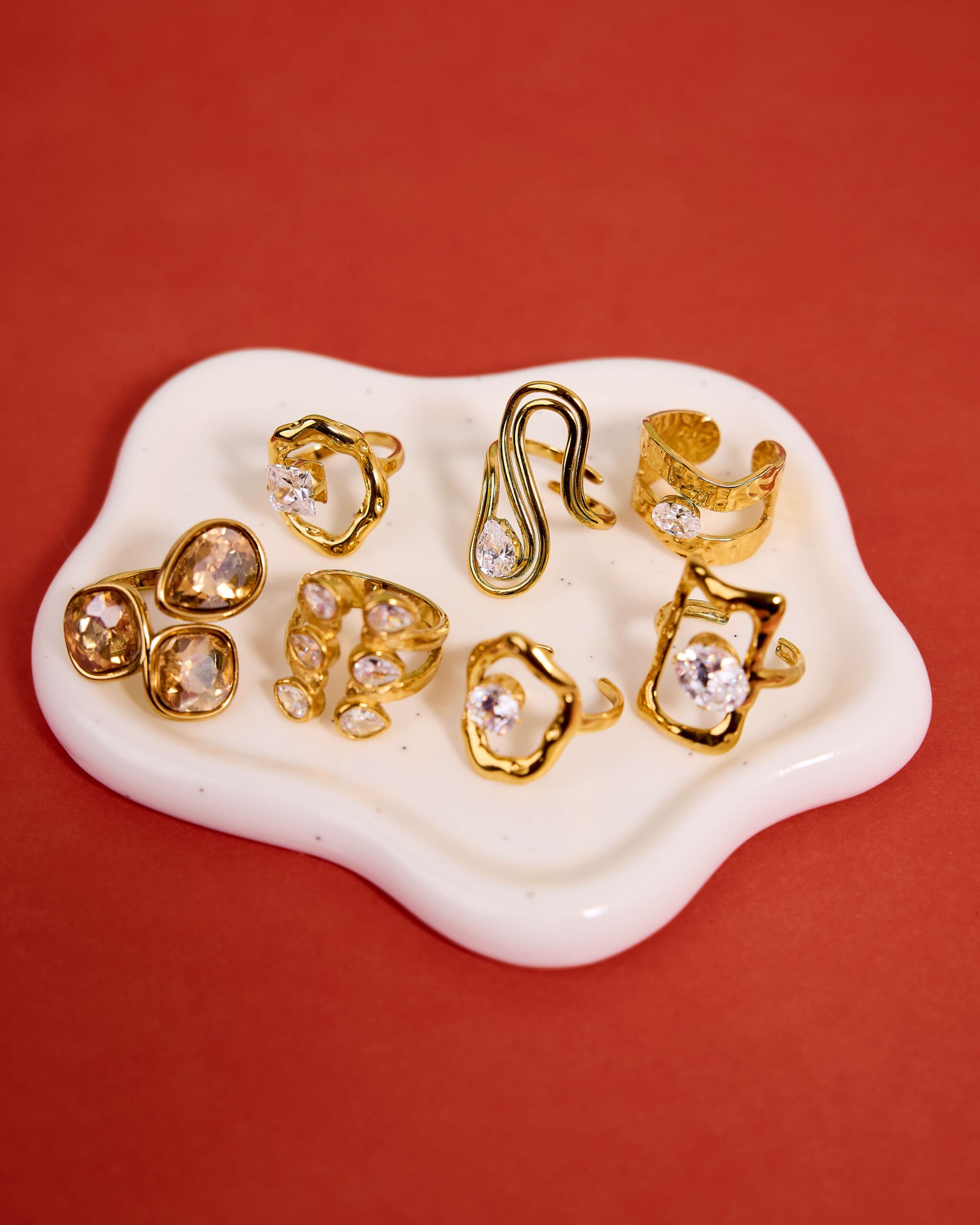Bague Kelya en acier inoxydable plaqué or 18K au design irrégulier texturé, ornée d’un zircon ovale étincelant. Style audacieux et contemporain, taille ajustable.