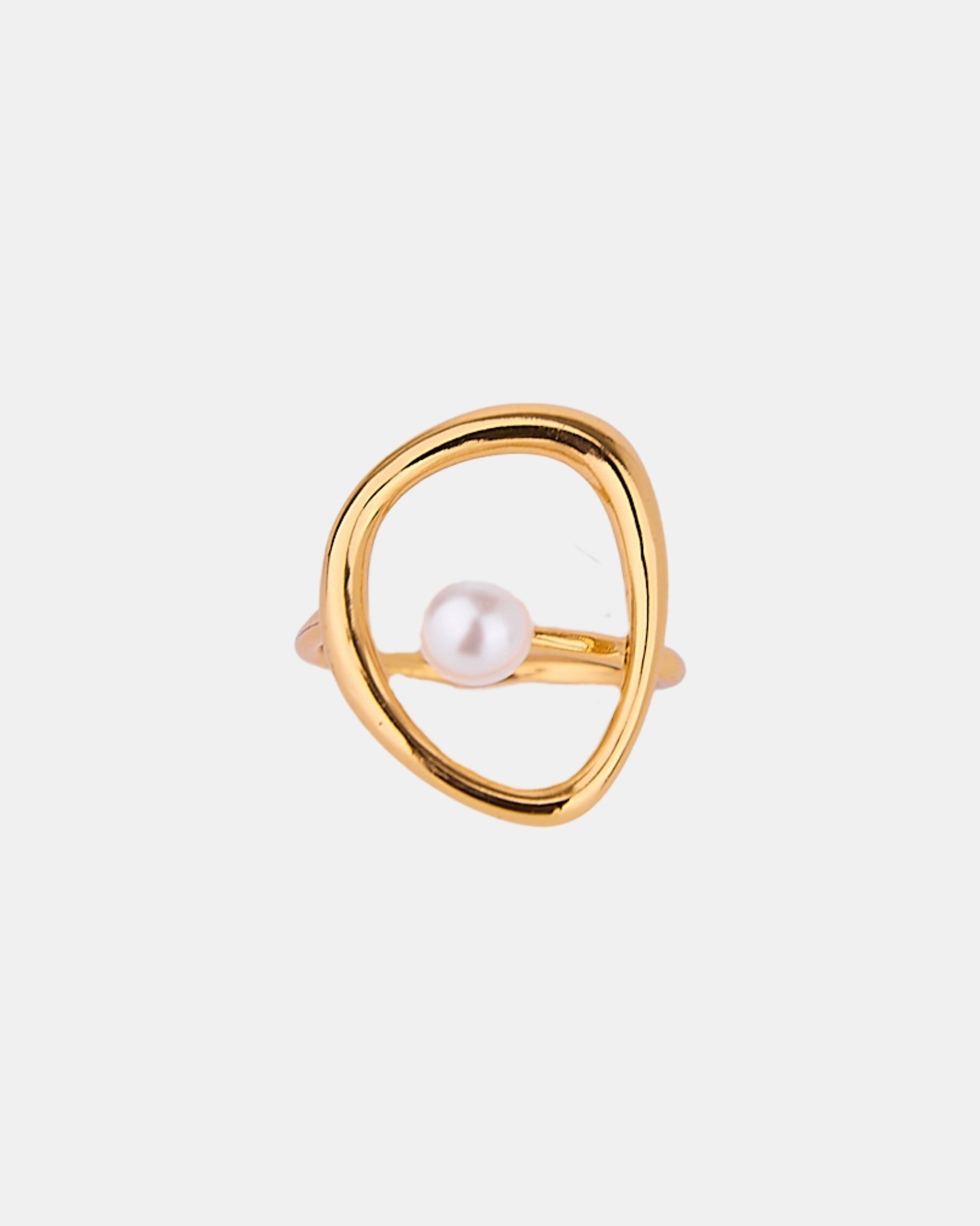 Bague Liyah en laiton plaqué or 24K, anneau ovale épuré avec une perle en suspension. Design minimaliste et poétique, élégance intemporelle.