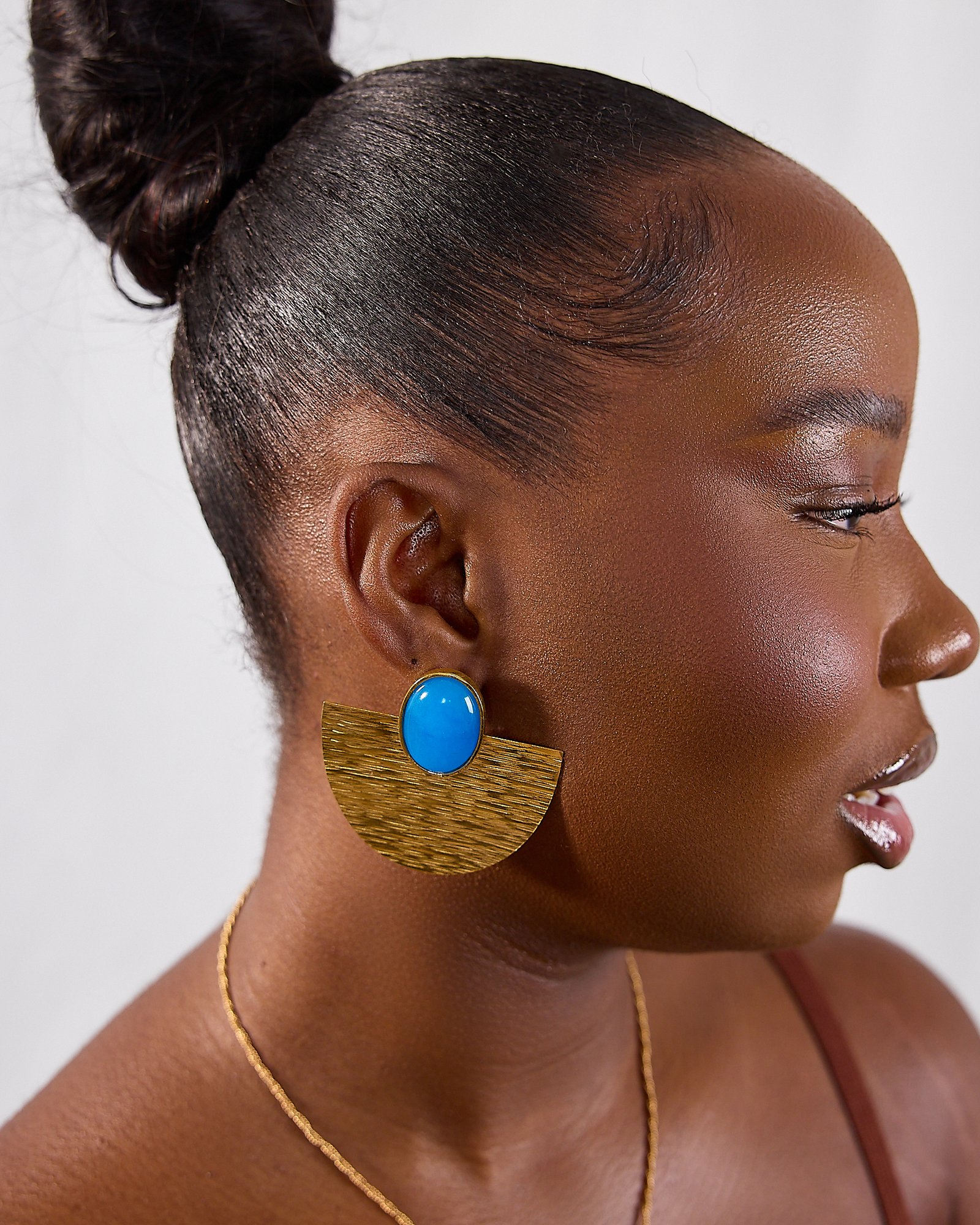 Ces boucles d’oreilles en bronze plaqué or, rehaussées d’une perle bleue, sont façonnées à la main par des artisans au Sénégal. Leurs courbes élégantes racontent cette douceur héritée — cette force discrète que chaque femme porte en elle sans toujours la nommer.