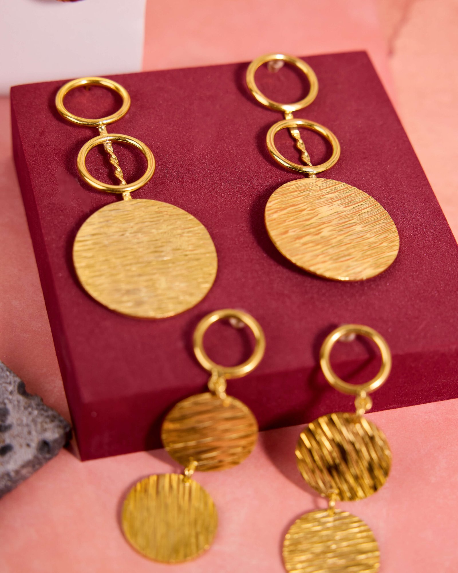 Ces boucles d’oreilles captent cette même énergie. Asymétriques, façonnées à la main par des artisans au Sénégal, en bronze plaqué or, elles jouent sur le déséquilibre avec une grâce maîtrisée — parce que la vraie élégance n’a pas besoin de symétrie. Chaque paire est unique, comme le style de celle qui les porte.