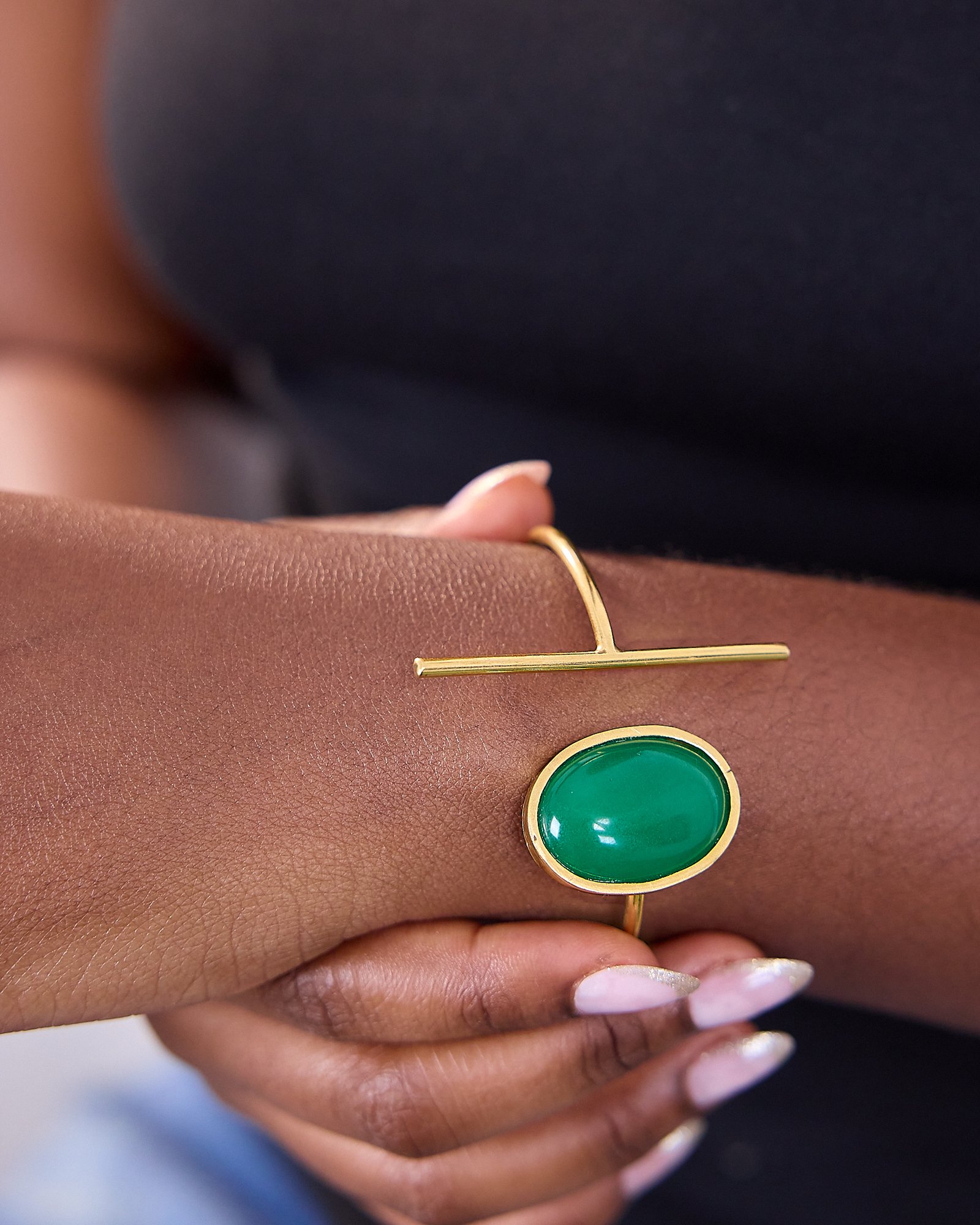 Le bracelet Afia associe le bronze plaqué or à de subtiles touches vertes, évoquant la nature luxuriante. Façonné à la main. Collection Héritage – la fraîcheur du vert.