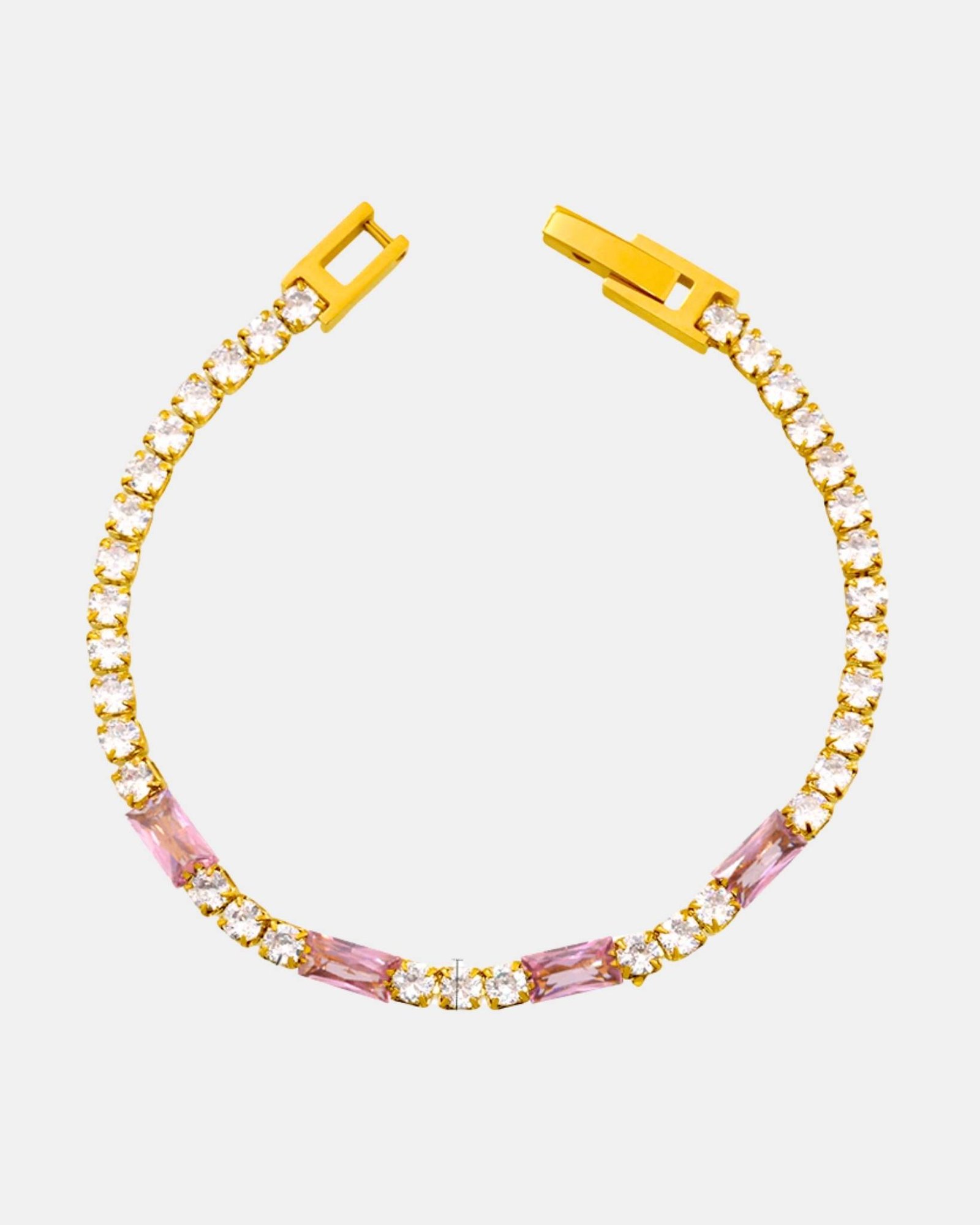 Son design tennis classique est revisité avec une touche colorée : de fines baguettes zircon rose poudré, subtilement mêlées à une ligne de zircons blancs éclatants. Ce jeu de lumière rose et doré crée une harmonie délicate, féminine et incroyablement élégante.