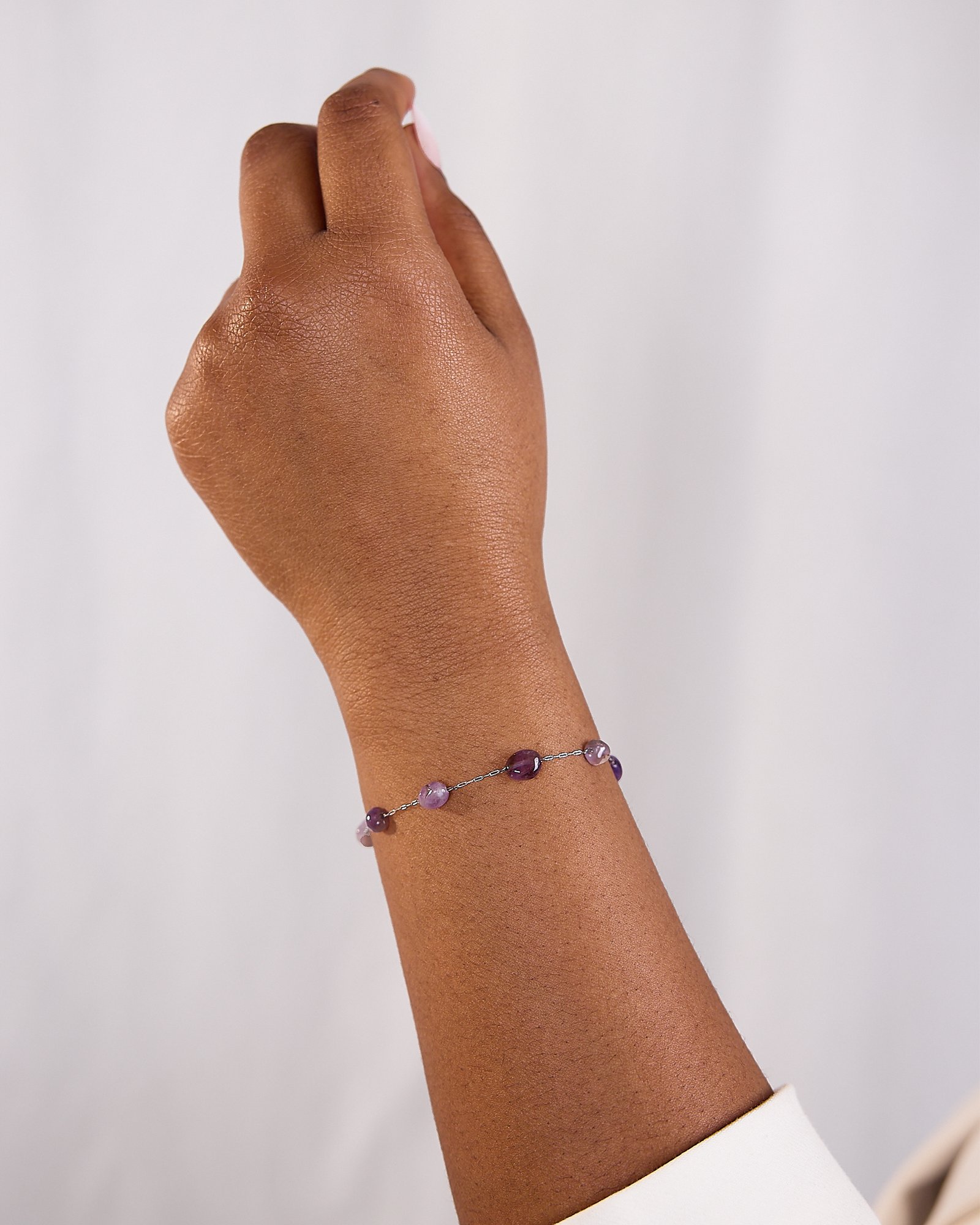 Le Bracelet Nadely célèbre la beauté brute de la pierre naturelle. L’améthyste, pierre de sérénité et d’intuition, apporte une touche spirituelle à ce bijou raffiné. Sa finition argentée offre une alternative chic à l’or, parfaite pour les carnations froides ou celles qui préfèrent l’éclat du métal blanc. Léger et ajustable, il s’adapte à tous les poignets avec confort.
